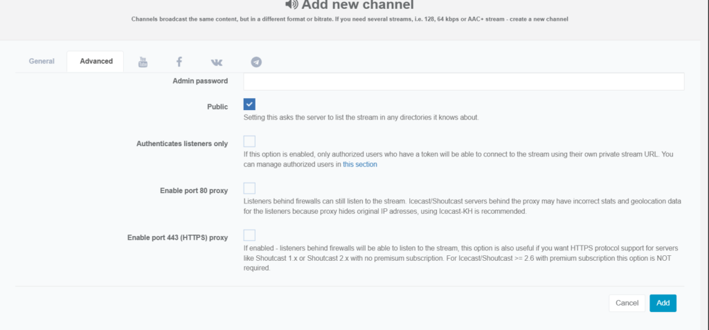 - Enable port 443 (HTTPS) proxy – If enabled – listeners behind firewalls will be able to listen to the stream, this option is also useful if you want HTTPS protocol support for servers like Shoutcast 1.x or Shoutcast 2.x with no premisum subscription. For Icecast/Shoutcast >= 2.6 with premium subscription this option is NOT required.