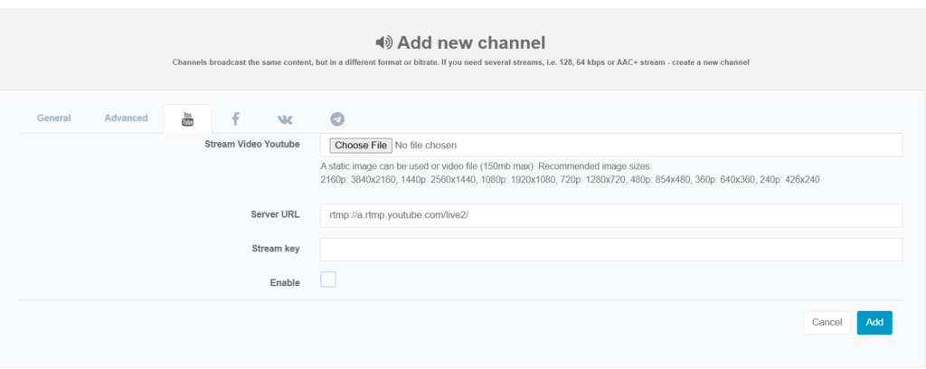 - Configure simulcasting to YouTube by entering your YouTube stream key and URL (if this feature is enabled on your account)
