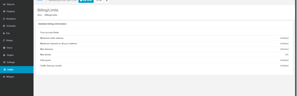 In Everest Cast, “limits” refer to the usage caps imposed on your radio station account by your hosting provider. These limits define how many resources your station can use.