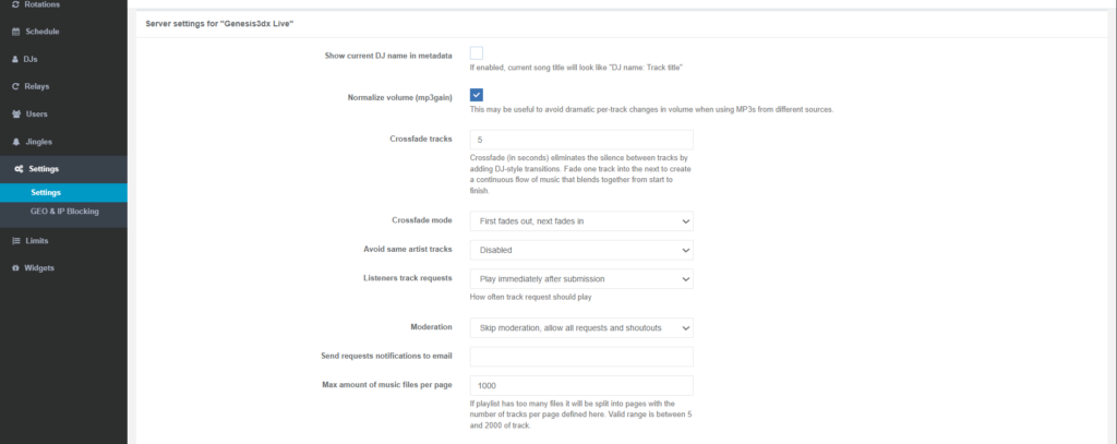 • Jingle Interval: Define how often jingles or station IDs are automatically inserted into your standard music rotation (e.g., every 5 or 10 tracks).