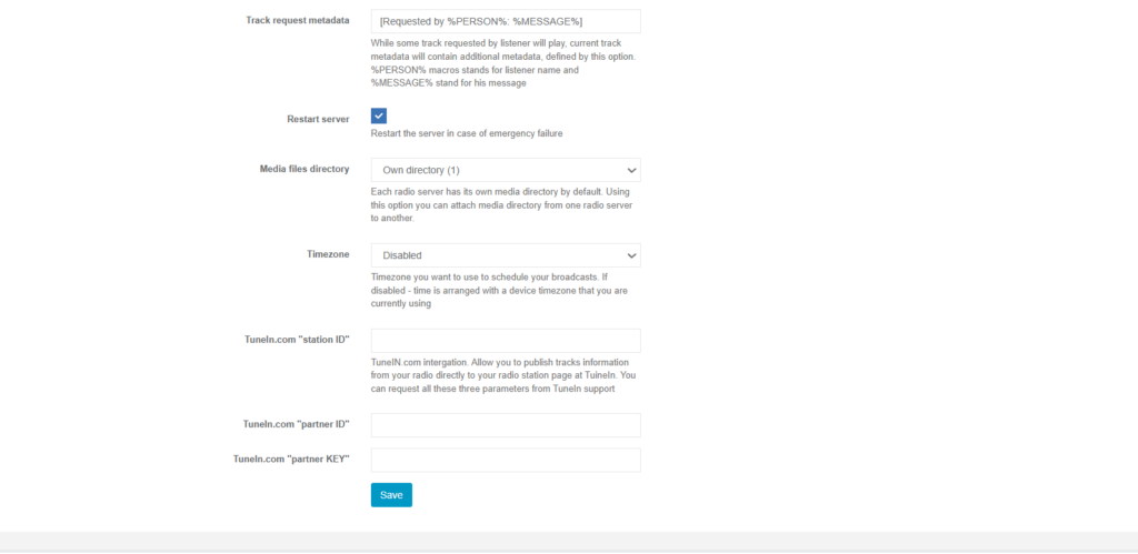 • API Credentials: Set up integration with third-party services like TuneIn Radio API credentials to list your stream in directories.