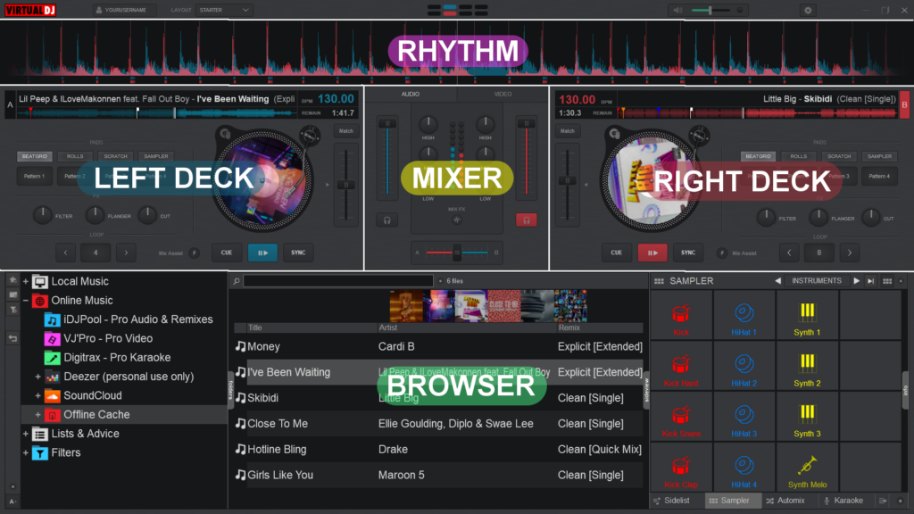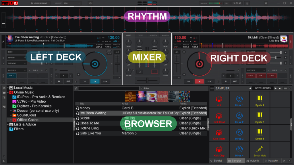 Before beginning to use VirtualDJ, it is important to familiarize yourself with the controls and the available sections of the default GUI (Graphical User Interface) or Skin.